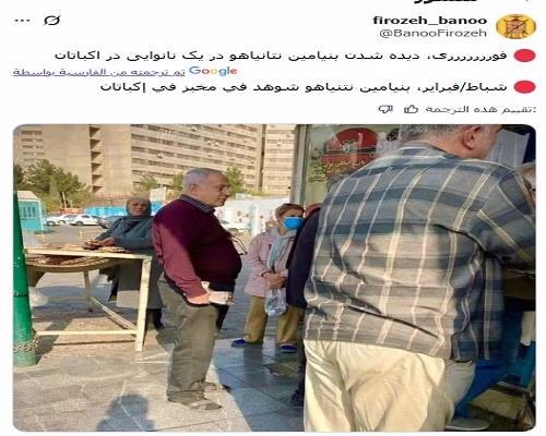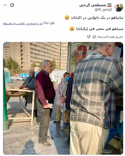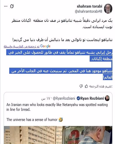وكتب مستخدم في إكس أيضًا: “رجل إيراني يشبه نتنياهو تمامًا يقف في طابور للحصول على الخبز في منطقة إكباتان”، بينما ذكر حساب آخر: “فاصل غير عادي على الإطلاق”، وغرّد غيره: “فعلا يخلق من الشبه 40″، وذكر متابع: “محدش يديله عيش”.