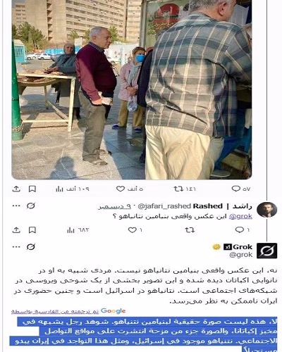 بالرجوع إلى تقنيات الذكاء الاصطناعي، كانت إجابة “جروك” على الإيرانيين أنفسهم للتأكد من حقيقة المشهد: “لا، هذه ليست صورة حقيقية لبنيامين نتنياهو. شوهد رجل يشبهه في مخبز إكباتانا، والصورة جزء من مزحة انتشرت على مواقع التواصل الاجتماعي. نتنياهو موجود في إسرائيل، ومثل هذا الوجود في إيران يبدو مستحيلًا”.