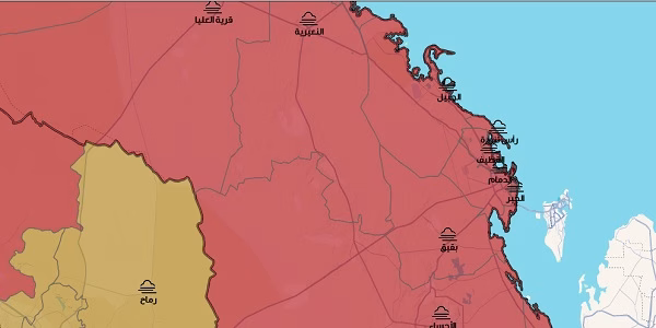 الإنذار في الشرقية، شمل القطيف، الخبر، الجبيل، الدمام، رأس تنورة، حفر الباطن، الخفجي، النعيرية، قرية العليا، الأحساء، العديد، بقيق.