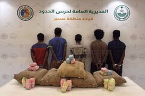 كما ألقت دوريات حرس الحدود بمنطقة عسير، القبض على (5) إثيوبيين مخالفين لنظام أمن الحدود، لتهريبهم (105) كيلوجرامات من نبات القات المخدر.