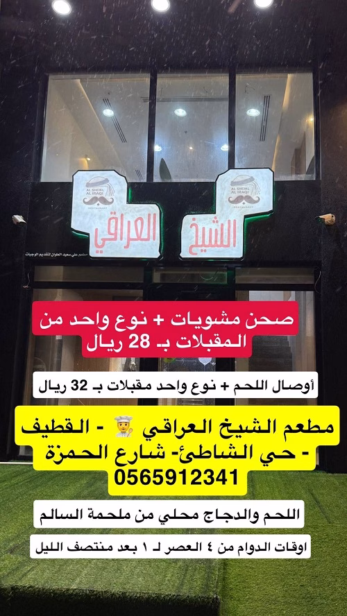 مطعم الشيخ العراقي مشويات + مقبلات بـ 28 ريال شاهدوا العروض https://youtu.be/OSovzS3au0E?si=AaFBPApzzpwpFMZh للطلب 0565912341 موقعنا القطيف- حي الشاطئ- شارع الحمزة