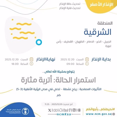 أصدر المركز الوطني للأرصاد، منذ قليل، إنذاراً أصفر بشأن استمرار الأتربة المثارة على المنطقة الشرقية.