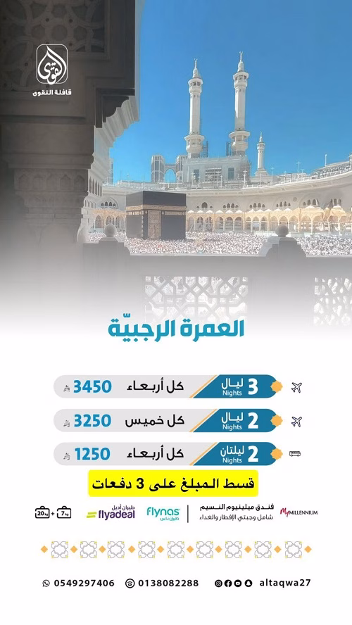 قافلة التقوى.. عمرة رجب.. قسط المبلغ على 3 دفعات
