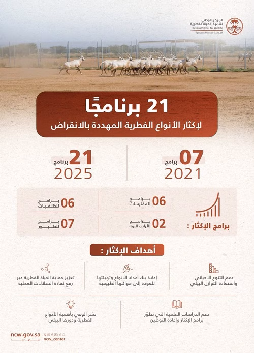 أعلن المركز الوطني لتنمية الحياة الفطرية، عن توسعه في منظومة الإكثار لتصل إلى 21 برنامجًا لإكثار الكائنات الفطرية.
