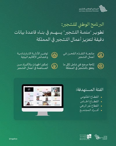 يطلقُ البرنامج الوطني للتشجير، خلال المرحلة المقبلة، «منصة التشجير»، التي تعدُّ مرجعاً فنياً شاملاً لدعم جهود تنمية الغطاء النباتي وتعزيز الاستدامة البيئية في المملكة.