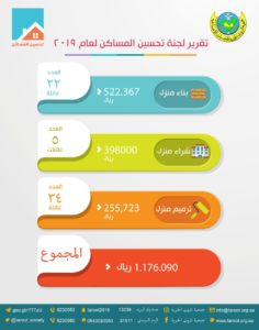 وبلغ مجموع مساعدات لجنة تحسين المساكن، ما يزيد قليلًا عن مليون ريال، حيث ساهمت الجمعية في بناء 22 منزلاً، بكلفة بلغت 522.367 ريالاً، إلى جانب المساهمة في شراء منازل لـ 5 عوائل بكلفة بلغت 398 ألف ريال. كما تم ترميم منازل لـ 34 عائلة، بكلفة 255.723 ريالاً، ليصل مجموع المصروفات 1.176.090 ريالاً.