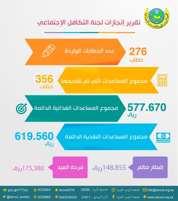 وقدمت لجنة التكافل الاجتماعي مساعدات نقدية بلغت 619.560 ريالاً، بينما بلغ مجموع المساعدات الغذائية الدائمة 577.670 ريالاً، مع تقديم مساعدات أخرى متنوعة لـ 356 حالة.