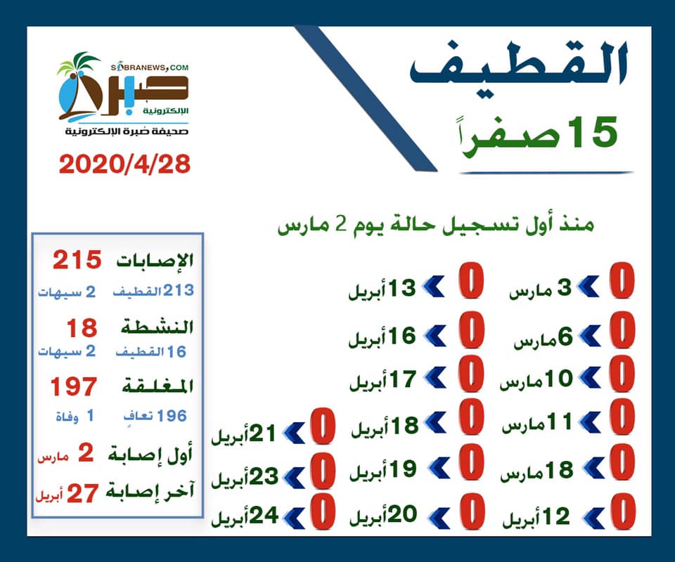- الحالات: القطيف: 213 + 2 سيهات: الإجمالي: 215.