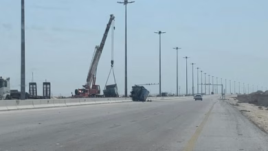 صفوى.. رفع شاحنة انقلبت في طريق جسر راس تنورة الجديد